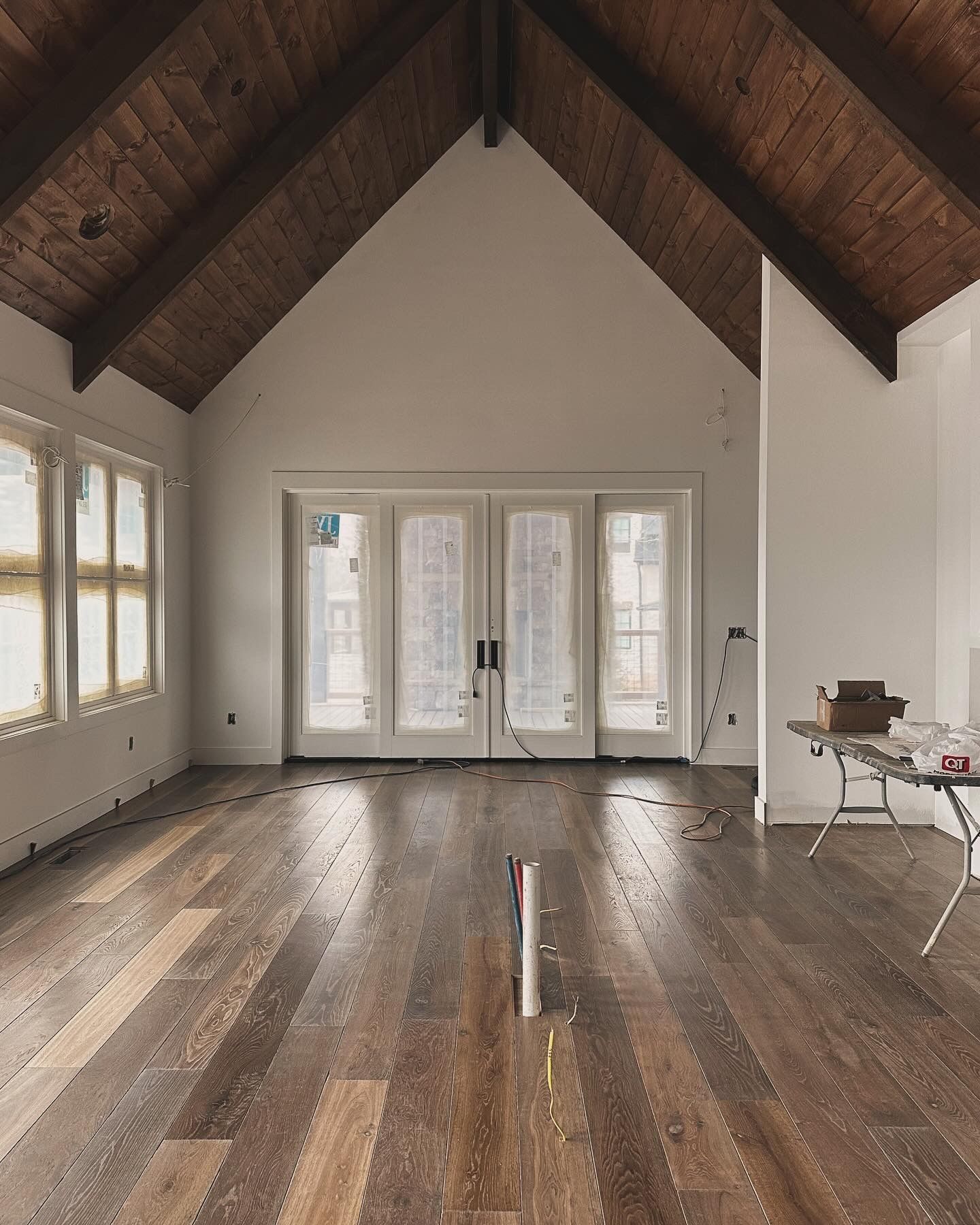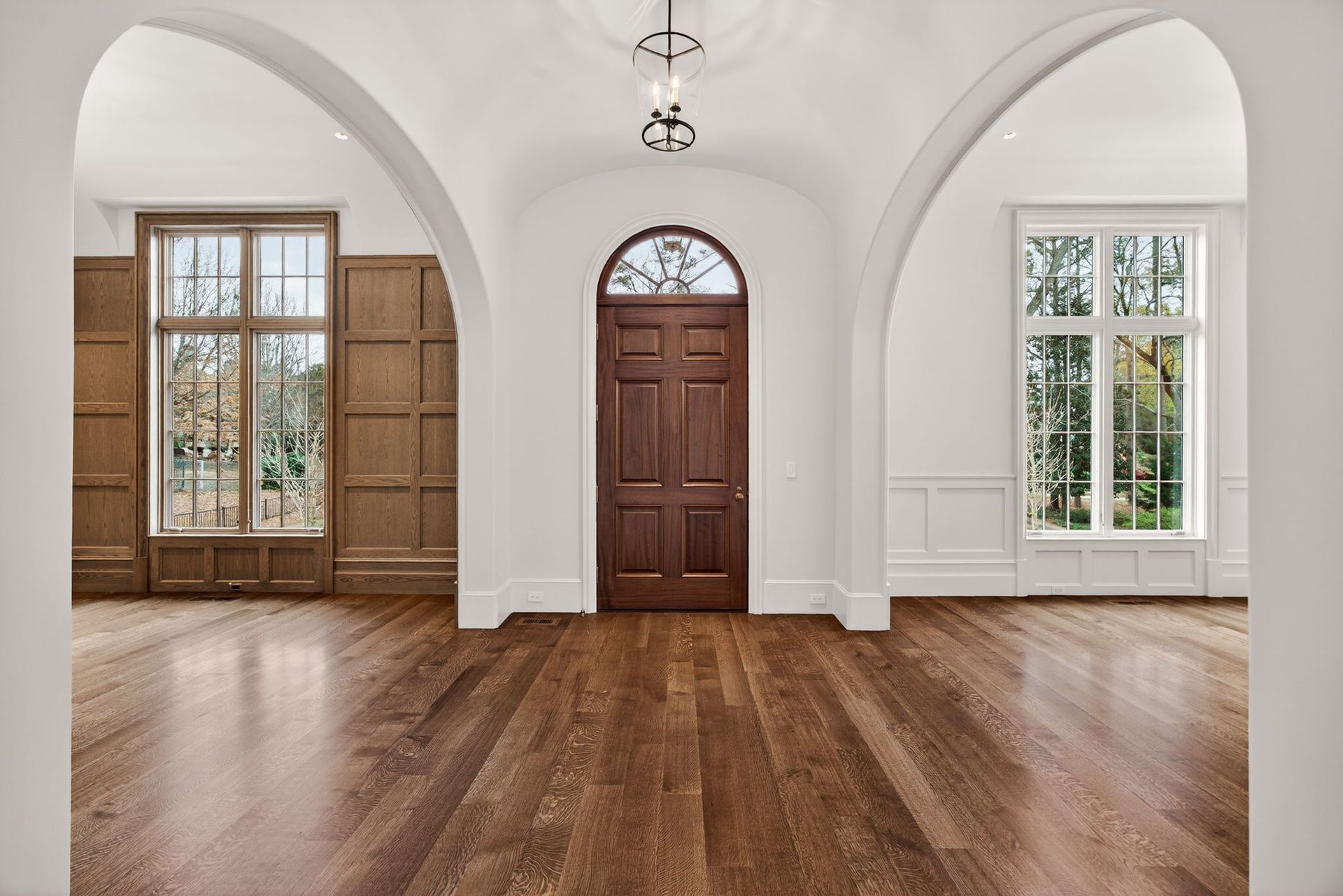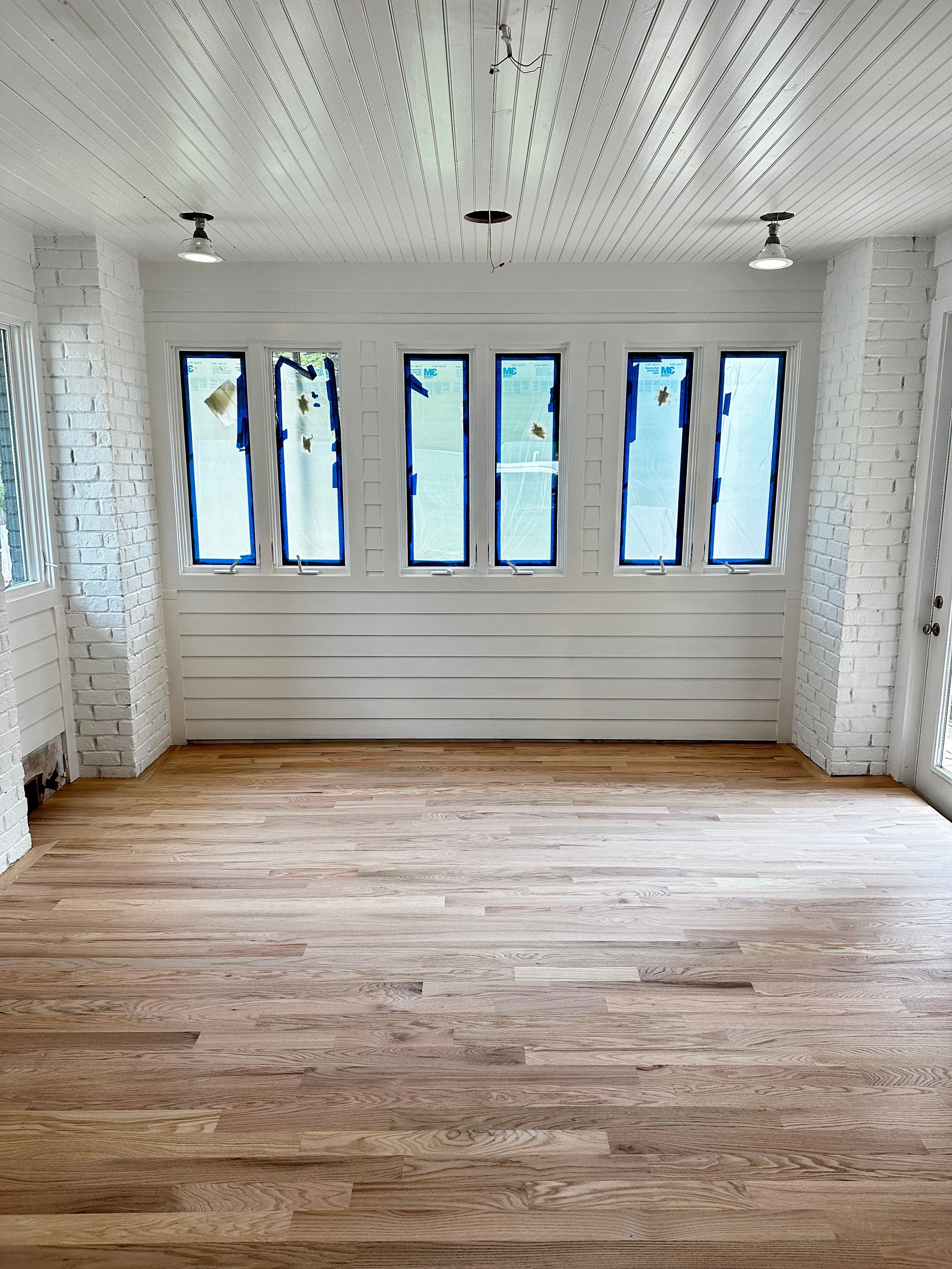 A large empty room with hardwood floors and lots of windows.