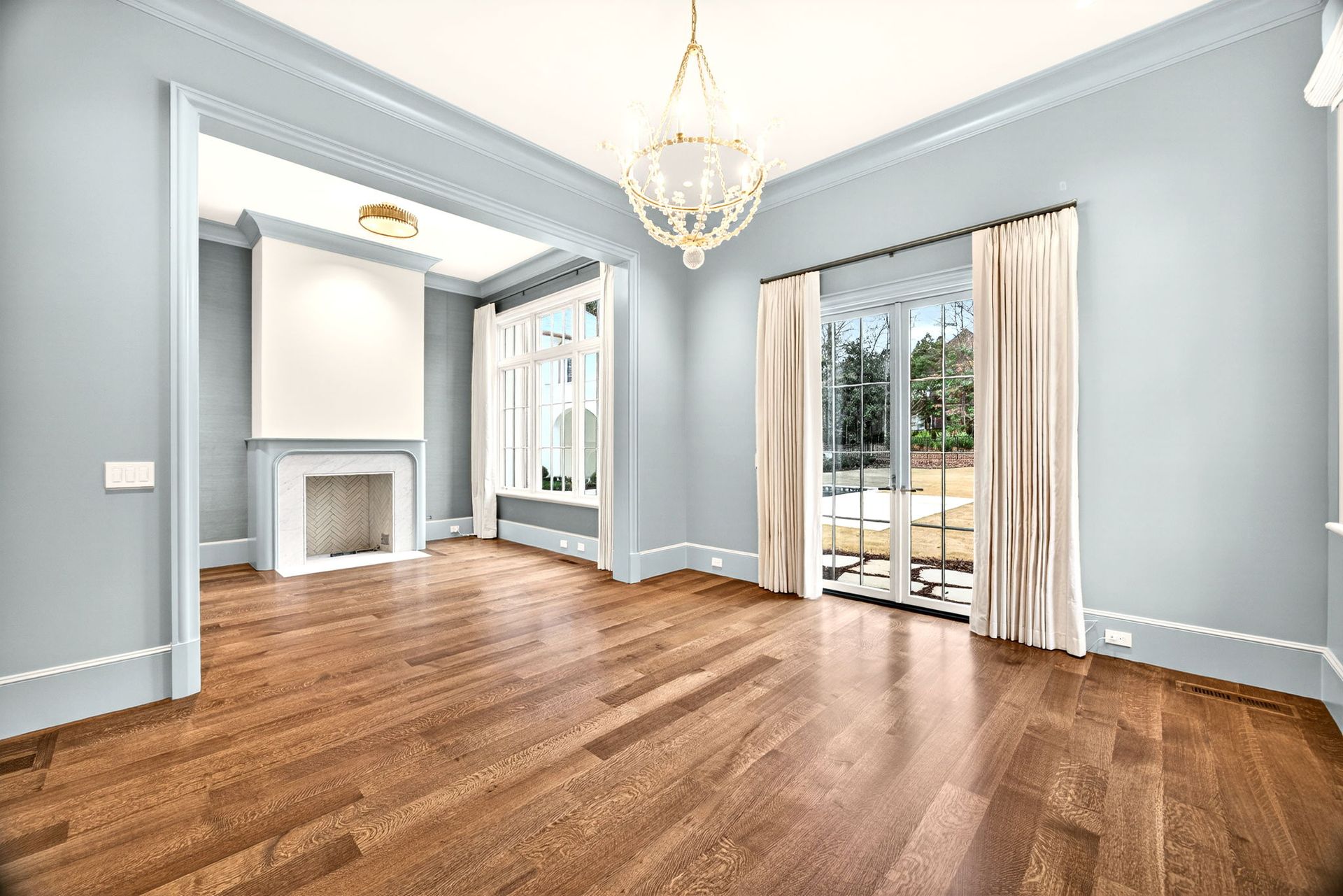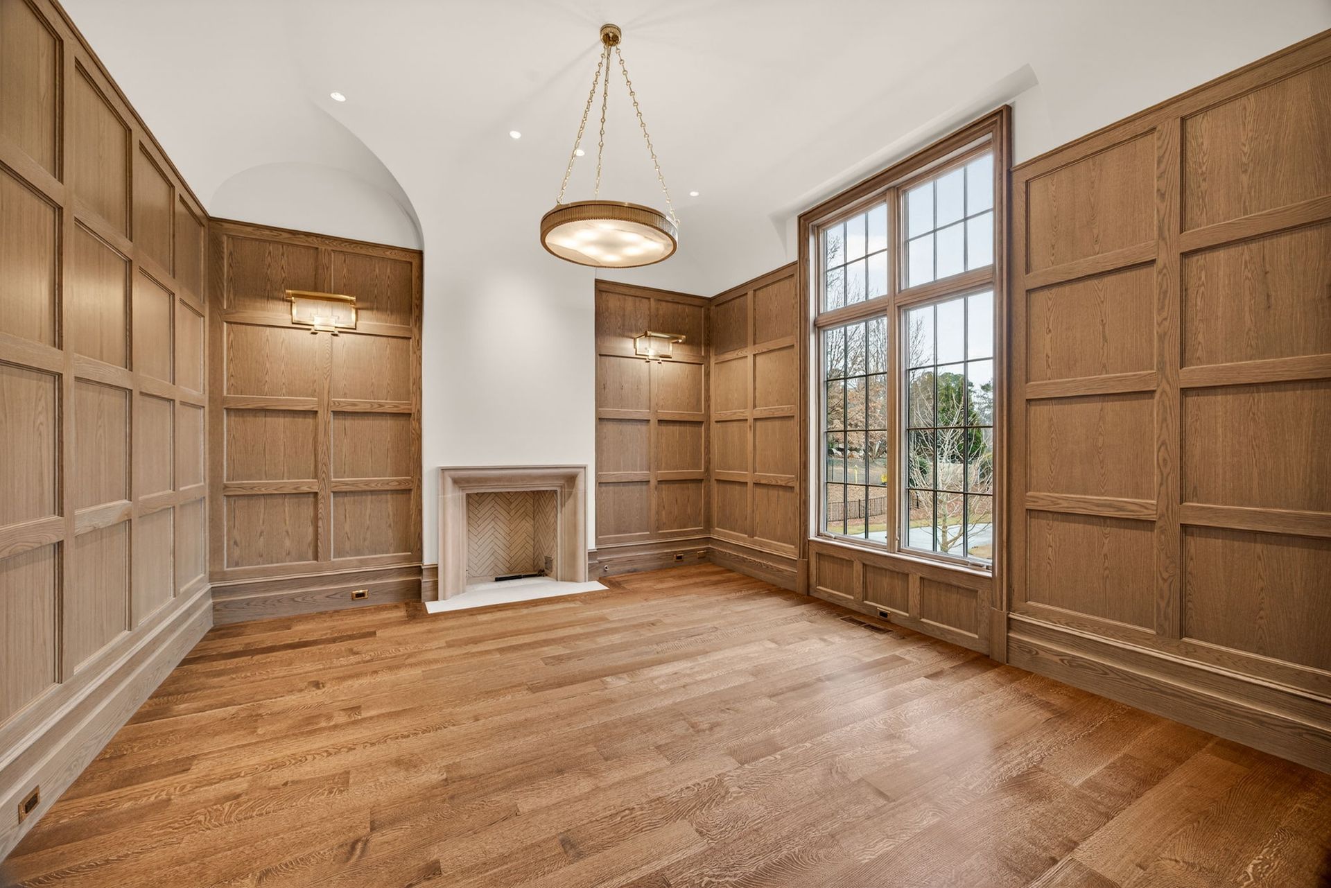 A large empty room with hardwood floors and a fireplace.