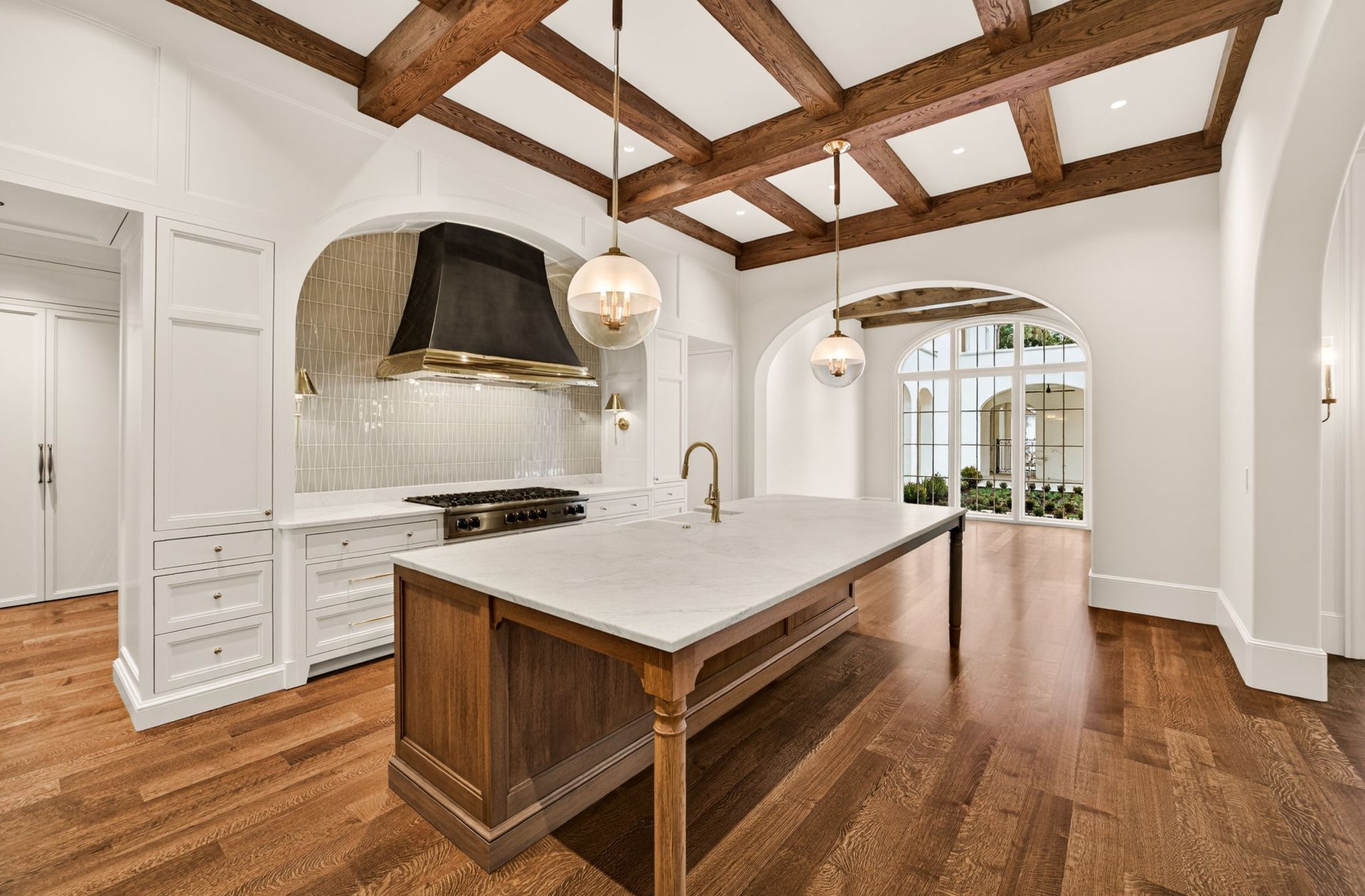 A kitchen with a wooden floor and a stove.