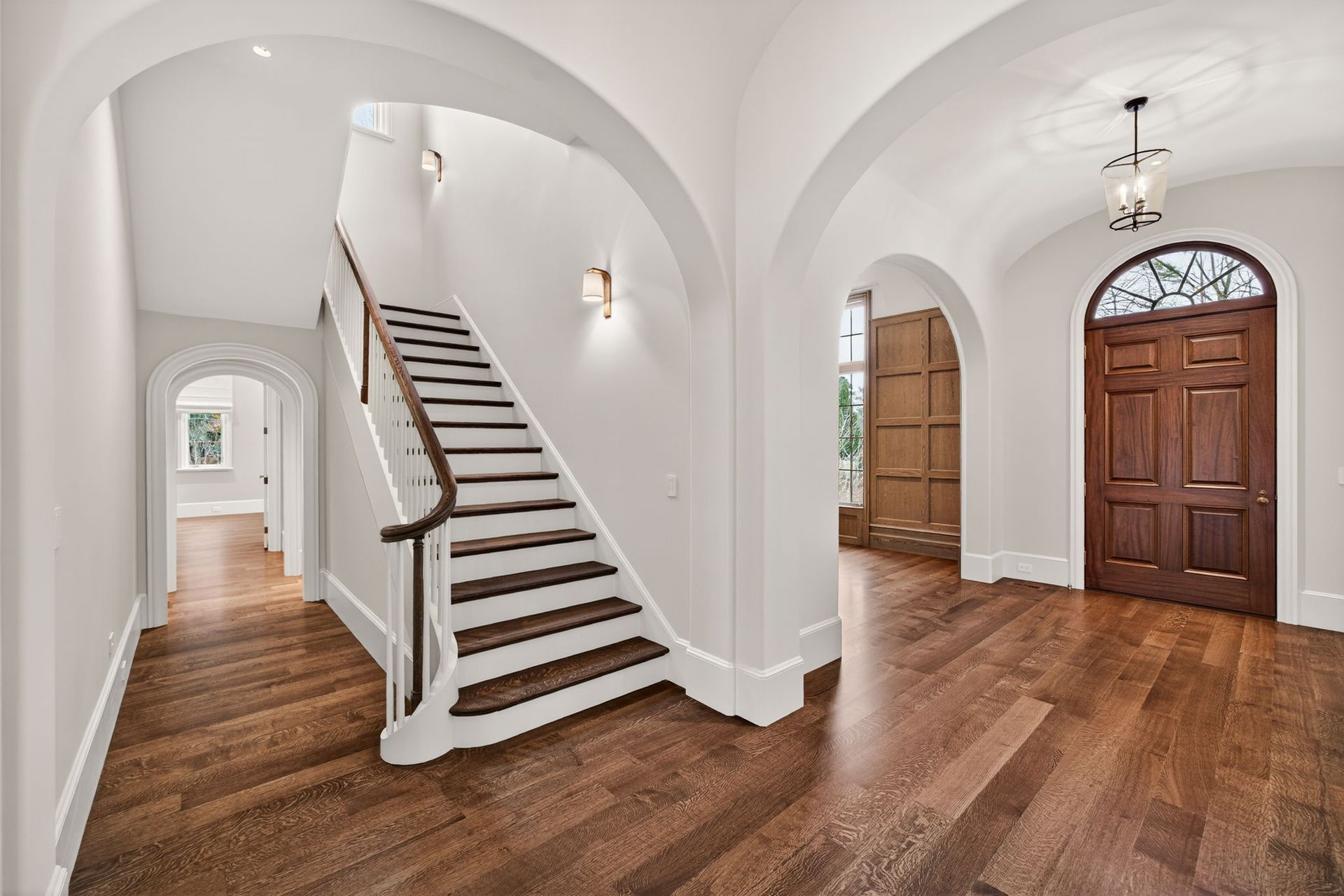A hallway with stairs leading up to the second floor