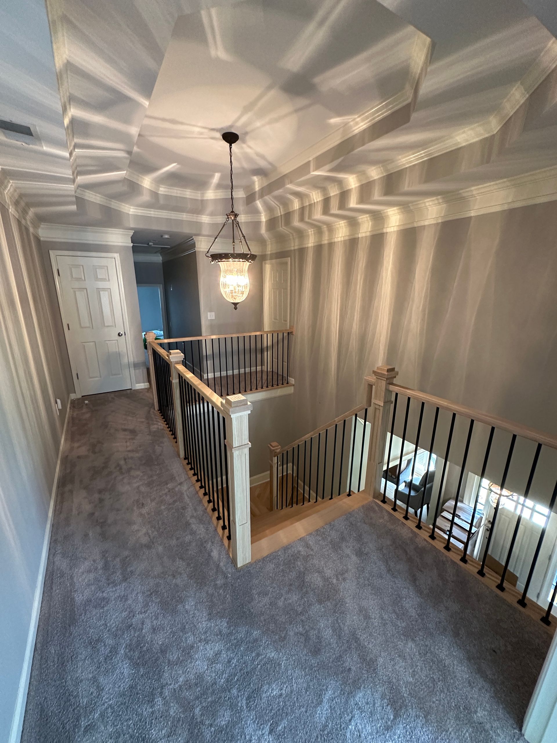 A wooden staircase with a black railing leading up to the second floor of a house.
