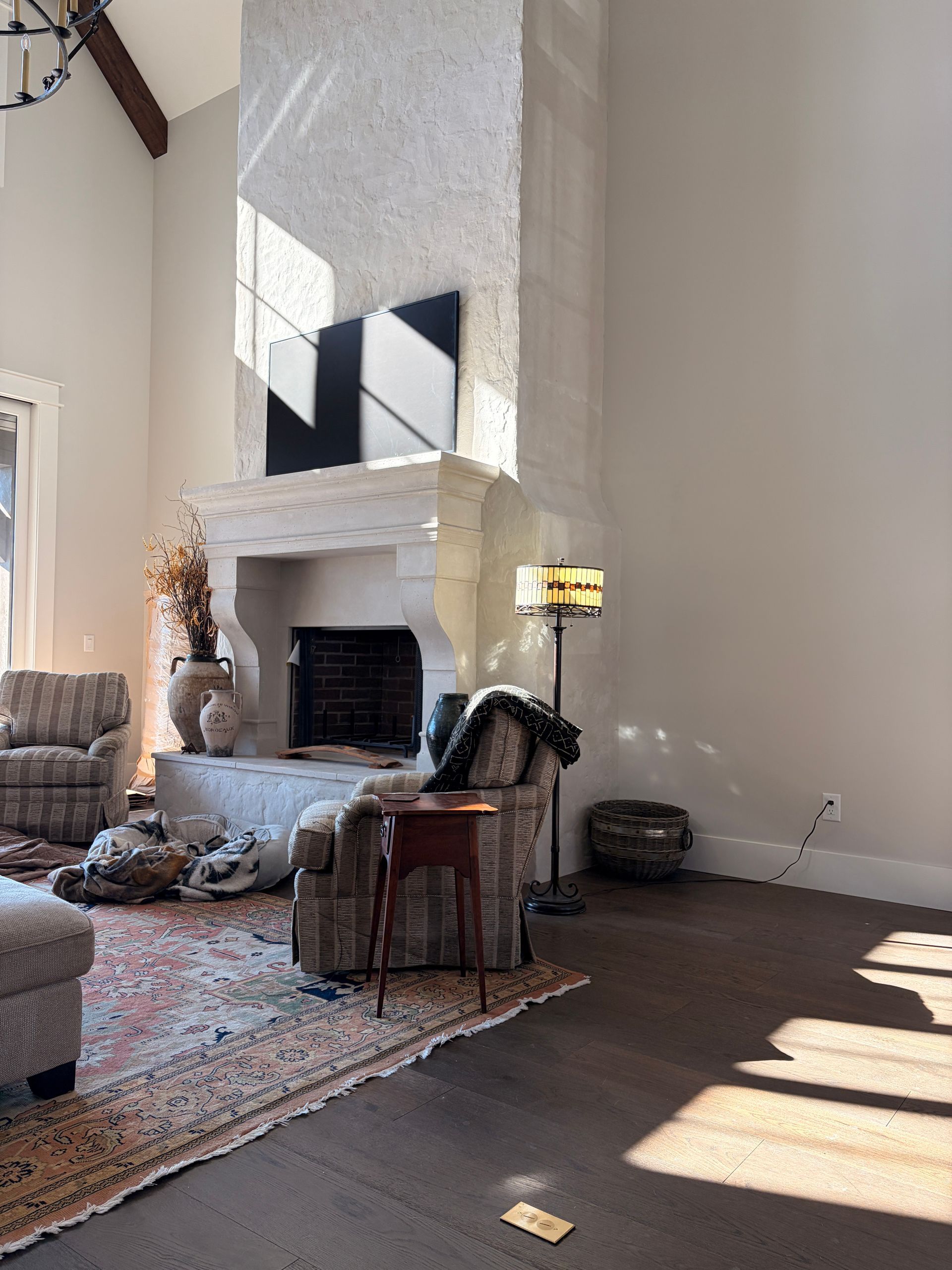 A living room with a fireplace and a ceiling fan
