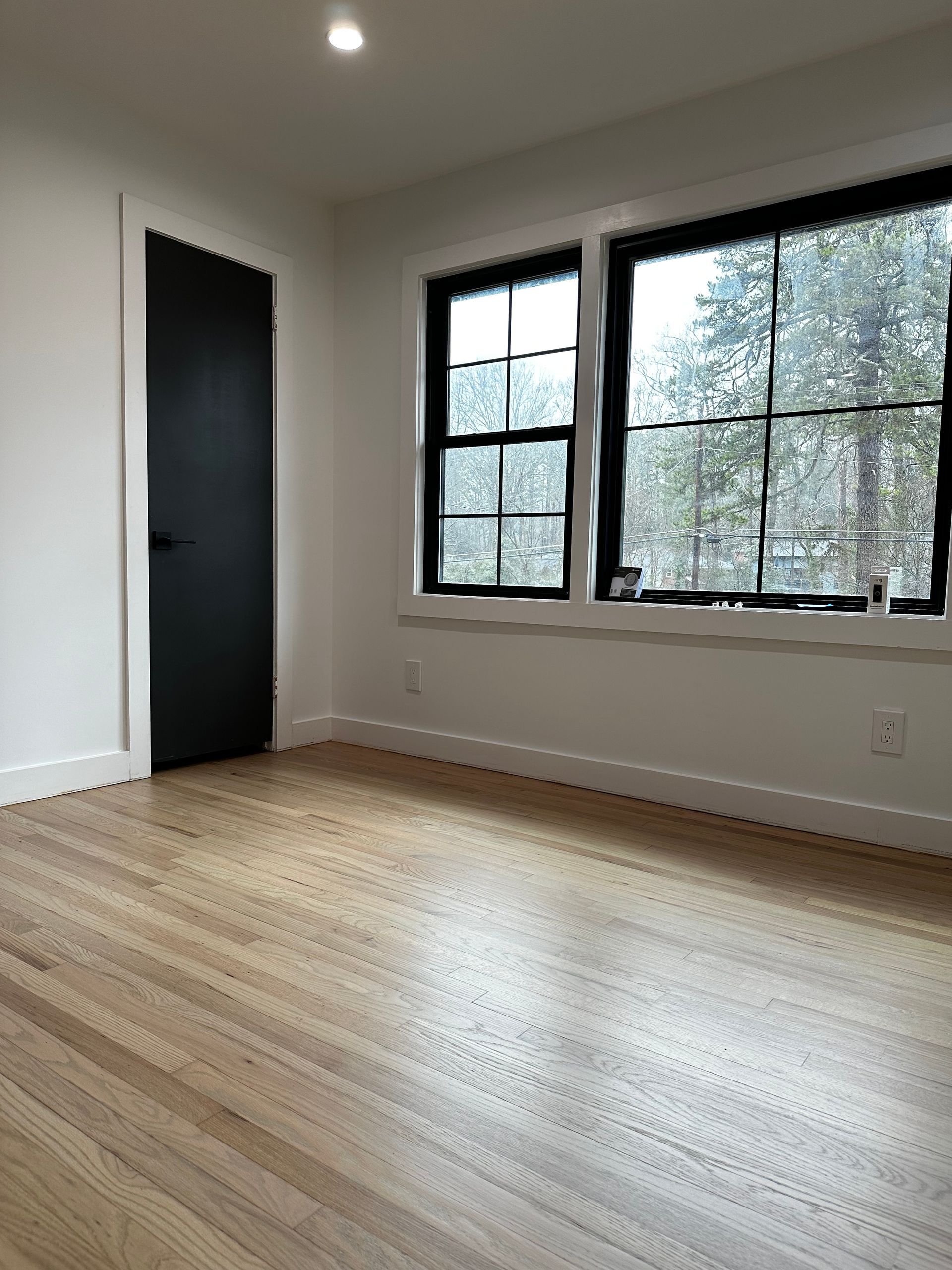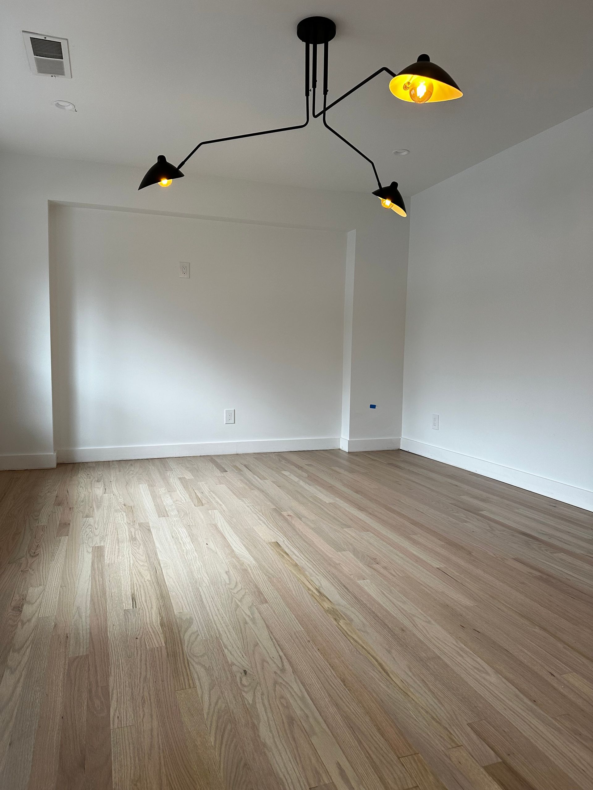 A large empty room with hardwood floors and white walls