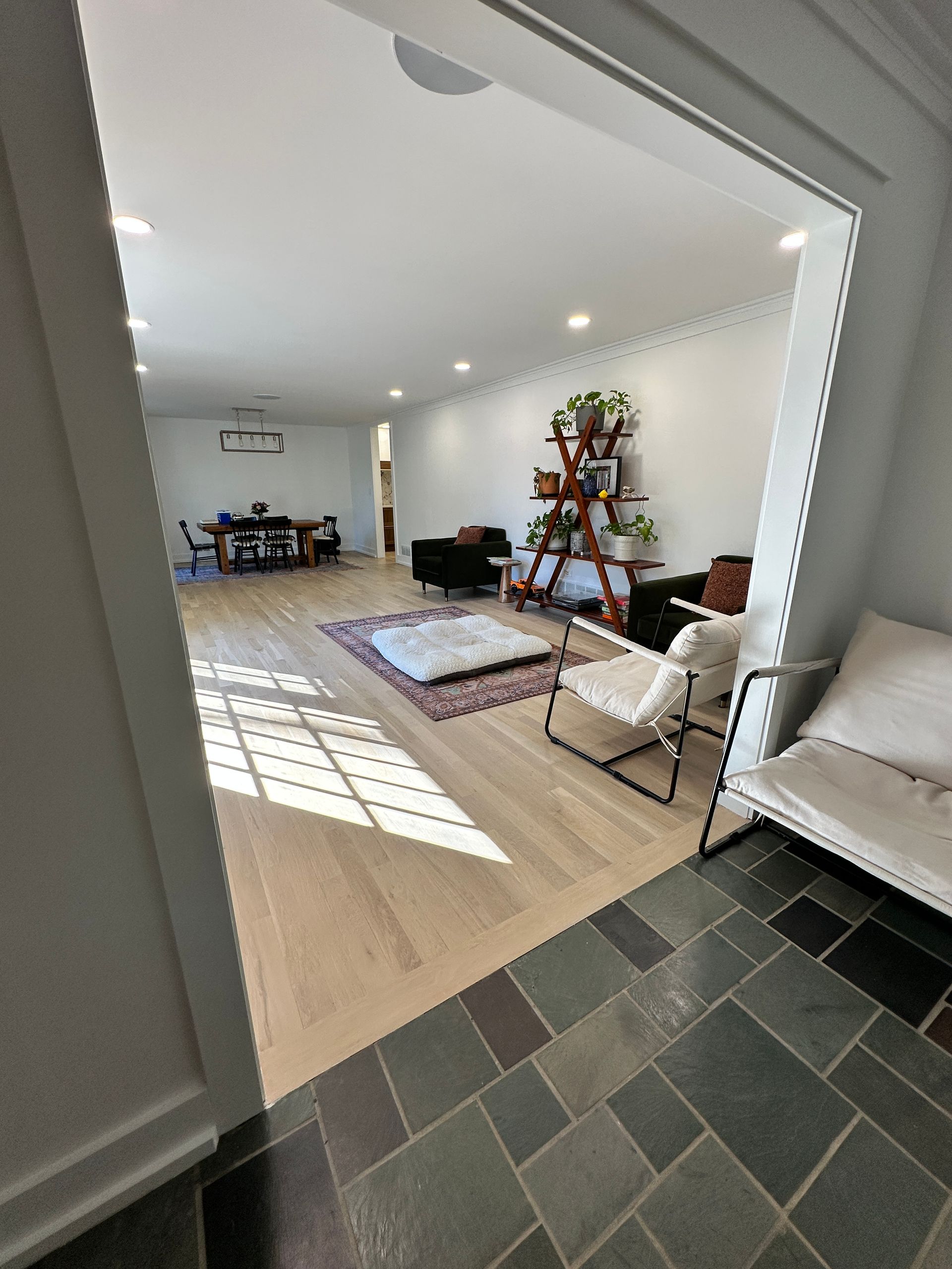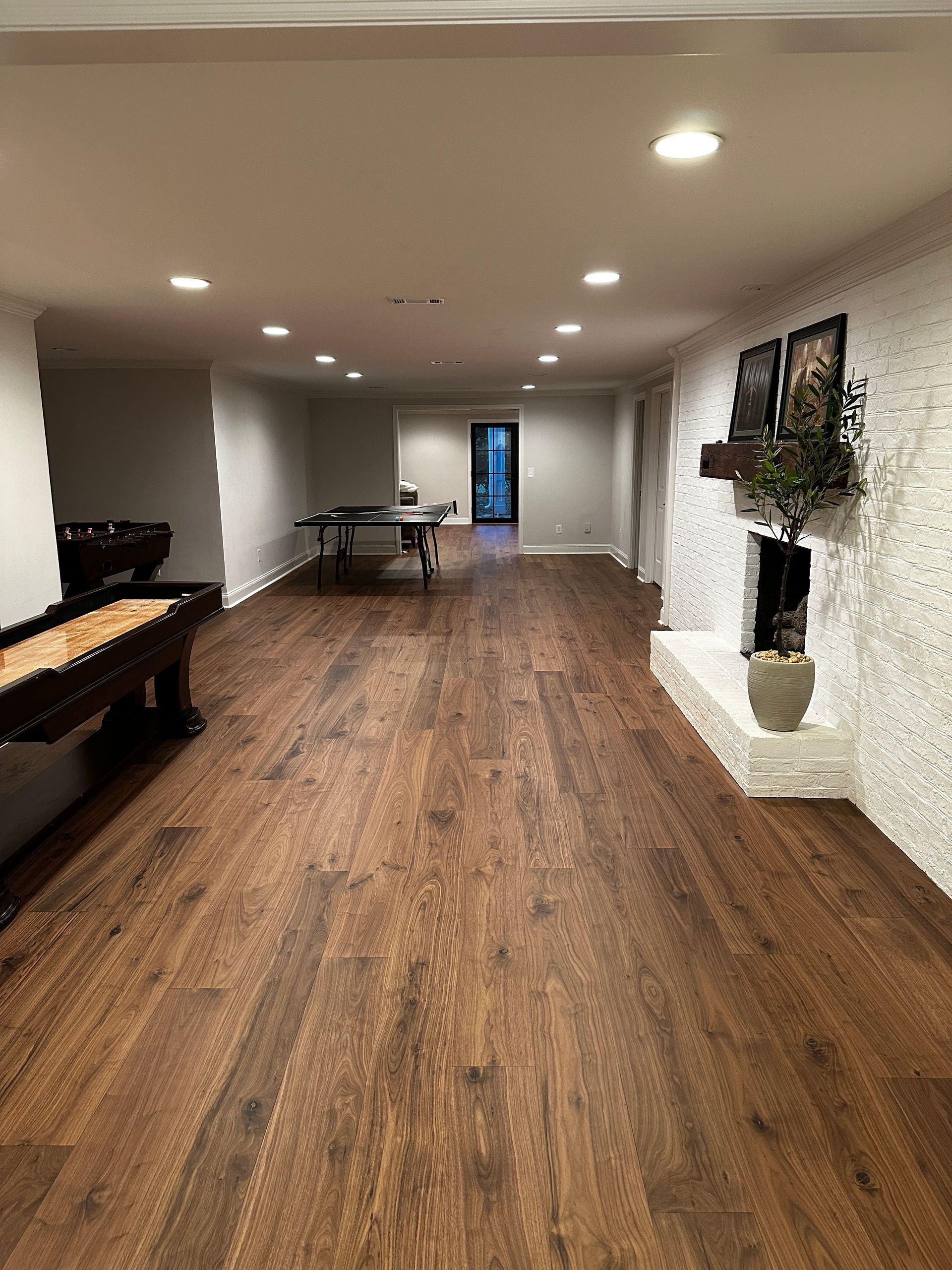A living room with wide plank laminate flooring