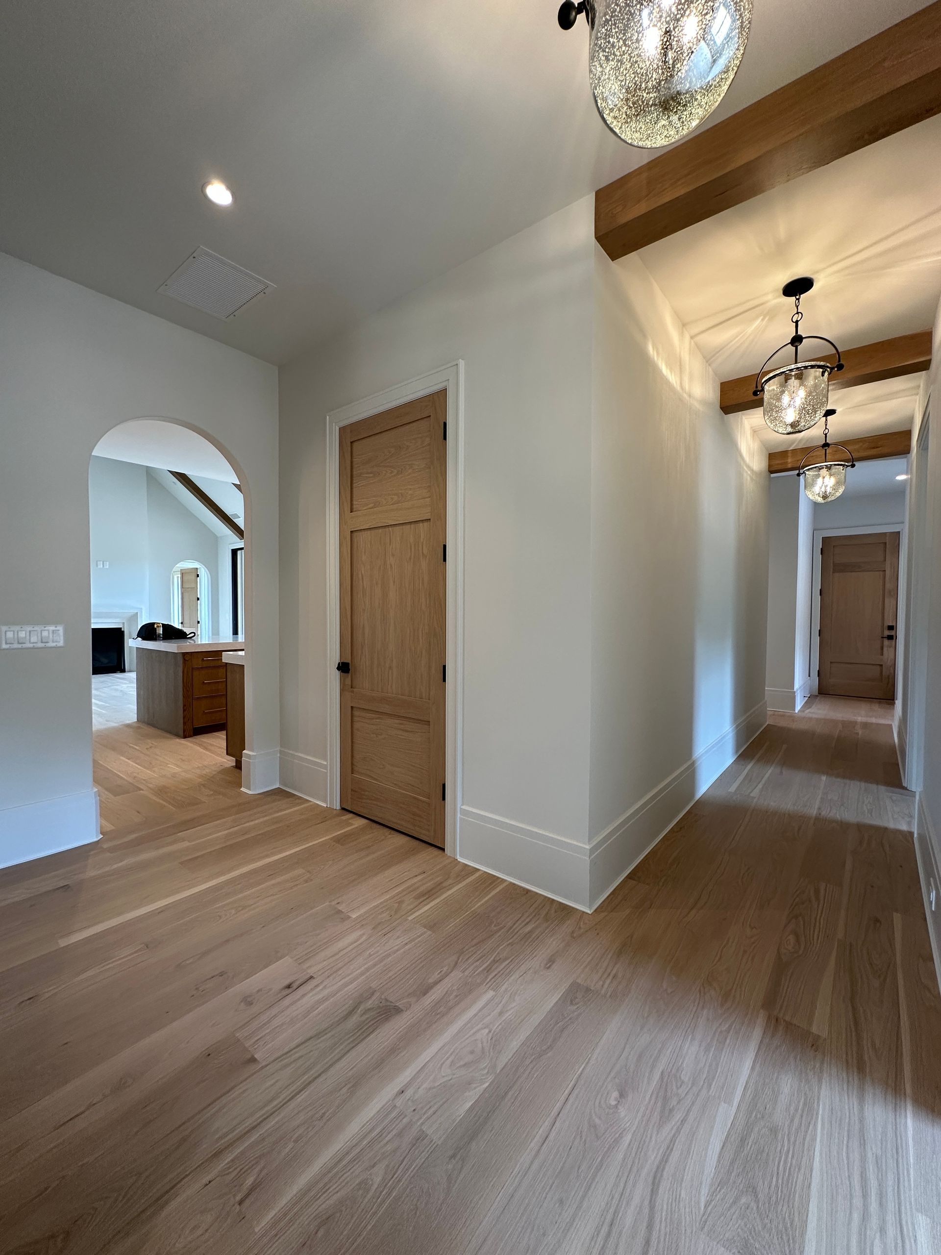 A hallway with wooden floors and white walls
